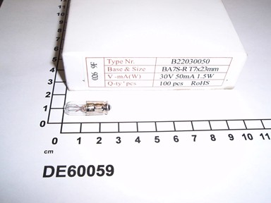 DE60059 LAMP, 1.2W 30V 50MA BA7S D7MM L=20MM Replaced Sign in or create a user account here to see more product details. Sign in or Register Product Details Product Description ca: Lamp D7 L20 30V 1,2W 40mA en: LAMP, 1.2W 30V 50MA BA7S D7MM L=20MM de: Lampe Ba7s D7 L25 30V 1,5W 50mA da: Lampe D7 L20 30V 1,2W 40mA zh: 灯 1.2W 30V 50MA BA7S D7MM L=20MM en: LAMP, 1.2W 30V 50MA BA7S D7MM L=20MM Material Utilisation Group 06210 - CAR LIGHTING 06210 - CAR LIGHTING Material group B90 - Light fittings and lamps Gross weight 0,003 Unit of weight kg Sales Unit of Measure PC